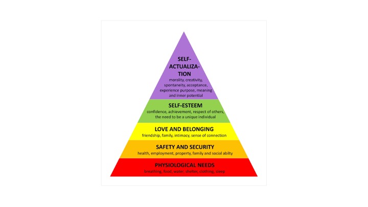 Maslow’s Hierarchy is a motivational theory comprising a five-tier model of human needs, and is often shown as hierarchical levels within a pyramid. At the bottom of the hierarchy are the physiological needs (Breathing, eating, water, shelter, clothing, sleep), followed by safety, love and at its peak, self-actualization: the latter of which includes the motivation of creativity.